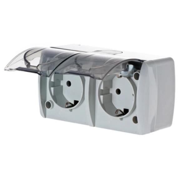 Розетка двойная с крышкой с заземлением IP54 El-Bi EVA коммутирует сети освещения и другие маломощные бытовые потребители. Материал корпуса изготовлен из термостойкого устойчивого к царапинам пластика, который не поддерживает горения, а также выключатель ударостойкий и устойчив к ультрафиолету.