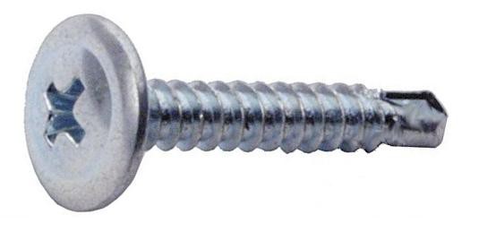Изготовлен из стали, поверхность оцинкована. Наконечник со сверлом, головка полусферическая с выштампованной шайбой, шлиц крестообразный Phillips №2, шаг резьбы частый.