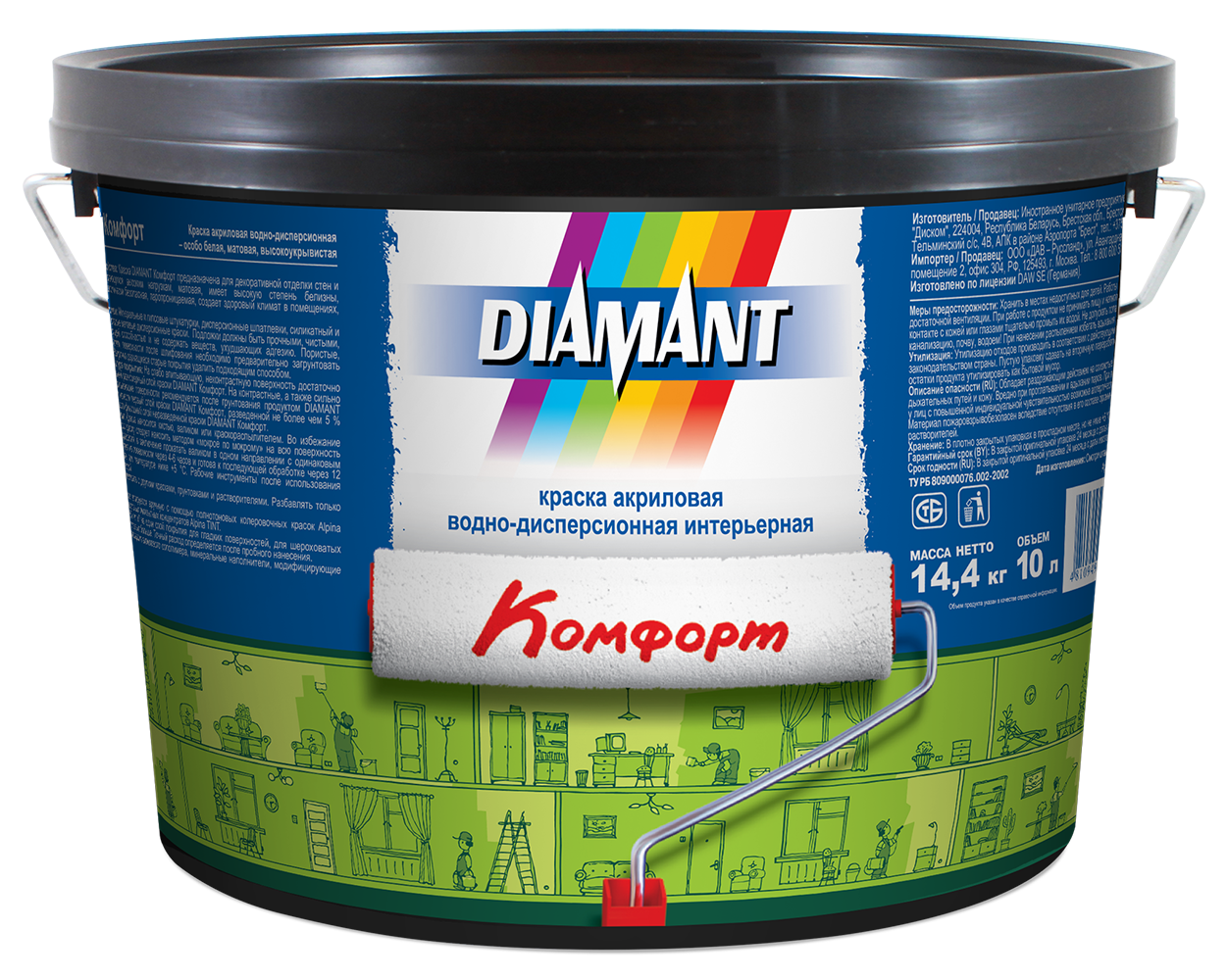 Краска ВД-АК Diamant Комфорт (белая) 0,9л. Предназначена для декоративной отделки стен и потолков не подвергающиеся особым нагрузкам.