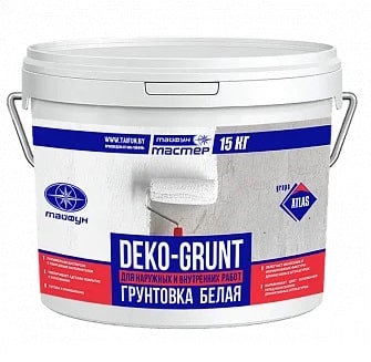 Грунтовка белая "Тайфун Мастер "DEKO-GRUNT" вед. 15 кг. Грунтовка «Тайфун Мастер «DEKO-GRUNT» специально предназначена для подготовки поверхности перед нанесением полимерных, полимерминеральных, минеральных штукатурок, в том числе с цветным наполнителем. Это готовый к использованию материал, представляющий собой дисперсию полимера с добавкой кварцевого песка, обладающий отличной адгезией к минеральным основаниям, ГКЛ, ГВЛ. Для подготовки поверхности под нанесение цветных декоративных составов грунтовка может колероваться пигментными пастами, предназначенными для водно-дисперсионных красок, что позволяет обеспечить однотонность цвета декоративного слоя.